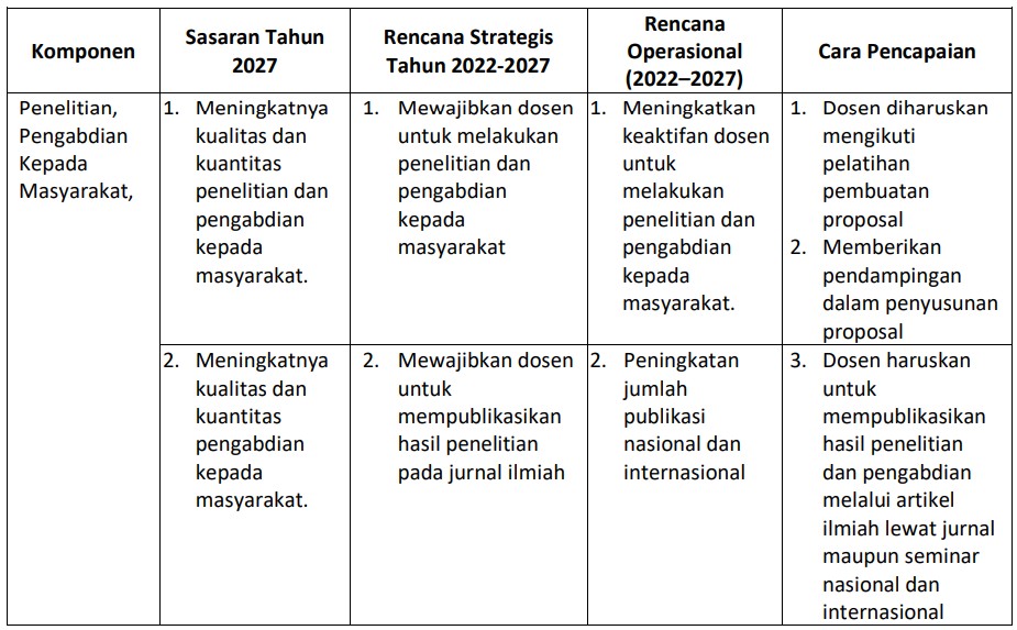 Dalam rangka peningkatan kualitas dan meningkatkan daya saing, Fakultas Teknik Universitas Katolik Santo Thomas berupaya melalui optimalisasi sumber daya manusia terbatas. Untuk mencapai hal ini, rencana operasional Penelitian dan Pengabdian Kepada Masyarakat (2022-2027) dapat ditampilkan sebagai berikut.